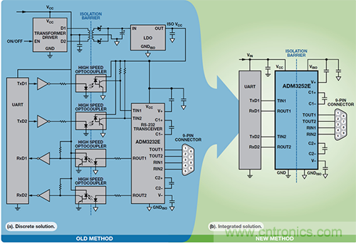 圖 5. 隔離式 RS-232 設(shè)計比較