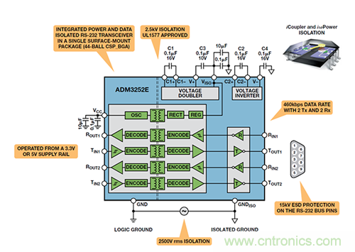 ADM3252E(圖 6)將一個標(biāo)準(zhǔn) RS-232 收發(fā)器與一個 4 通道iCoupler 結(jié)合,用于提供 RS-232 數(shù)據(jù)信號的信號隔離。它還集成 isoPower 技術(shù),以提供片內(nèi)電源隔離。通過將 iCoupler和isoPower隔離技術(shù)相結(jié)合而集成RS-232收發(fā)器,ADM3252E能夠在單個封裝(12 mm × 12 mm)內(nèi)提供具有 2.5 kV rms 隔離性能的完全隔離式 RS-232 接口,并且只需六個外部電容。