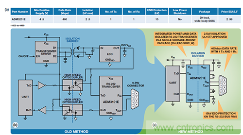 圖8. 單通道 RS232 收發(fā)器應(yīng)用 (a) ADM3251E 規(guī)格(b) 傳統(tǒng)方法 (c) iCoupler + isoPower 方法