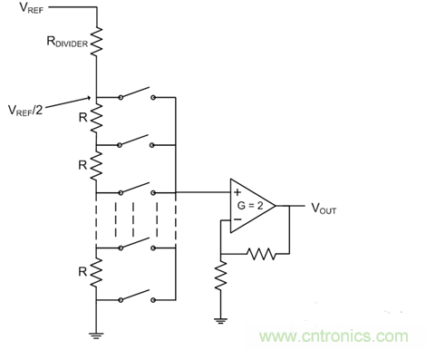 電阻串 DAC 設(shè)計最終、最微妙的元件是位于串電阻器及接點之前的分壓器。該電阻器電阻等于串中其余電阻器的等效阻抗,能有效將參考輸入減半。這樣做的目的是降低輸出緩沖器的共模輸入要求,并在實現(xiàn)良好性能的同時幫助保持低成本。為了對此進行補償,輸出緩沖器一般采取 2 倍的非反相增益,盡管有時反饋電阻器通過數(shù)字控制實現(xiàn)不同增益。