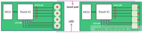 從LED驅動的角度,比較二者的異同。通常,觸控 IC內置了LED Driver。如果應用方案中需要使用LED表示觸控動作的有/無,并且應用產(chǎn)品的結構設計,要求LED緊鄰觸控電極,如圖5所示,那么使用觸控 IC更方便PCB的Layout。