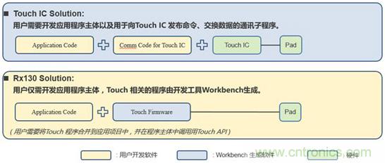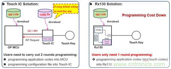 從程序燒寫的成本,比較二者的不同。如圖4所示,如果用戶不使用觸控 IC的缺省參數(shù),而是使用結合具體應用方案優(yōu)化后的參數(shù),那么需要通過編程器將最新的參數(shù)固化到觸控 IC。特別是批量生產(chǎn)時,增加了燒錄觸控 IC的額外成本。而右圖所示的Rx130方案中,僅需要將應用程序燒錄到Rx130中。