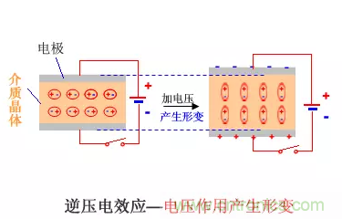 對具有壓電特性的介質(zhì)材料施加電壓,則產(chǎn)生機械應力,發(fā)生形變。