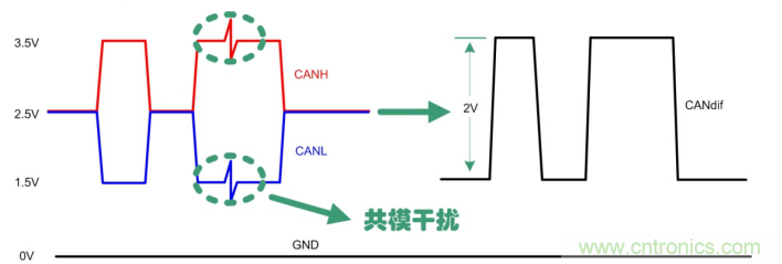 總線固有的差分傳輸形式使得CAN對于共模干擾有很好的抑制能力,如圖 4所示,通過CANH、CANL相減可很好地消除來自外部的共模干擾,但CANH、CANL并非理想對稱,快速上升的跳變沿,這些均會帶來EMC問題。我們通過示波器看總線波形很完美,測試靜電,EFT,浪涌,傳導騷擾抗擾均無異常。但測試傳導發(fā)射,則不能滿足限值要求,看起來很正常的總線實際卻向外在發(fā)送傳導干擾。
