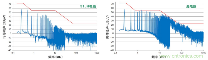 對于CAN接口的EMC問題,除了選用更好性能,符號要求的CAN收發(fā)芯片,另一種簡單的方法就是對CAN接口增加外圍,共模電感是一種很好的選擇。在現(xiàn)有汽車電子CISPR 25標準中,對傳導騷擾限值有很嚴格要求。許多CAN收發(fā)器均會超過限值。如圖 5分別為按照車規(guī)限制測試增加和不加共模電感的CAN接口傳導騷擾,共模電感值為51μH,可以看到在各個頻段下對噪聲改善較為明顯,測試結果仍有很大裕量。