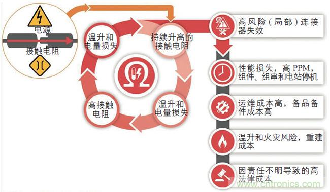 電站的盈利能力與選擇高質(zhì)量的部件息息相關(guān)。業(yè)主在光伏連接器上節(jié)省資金,并不是一種明智的做法。因?yàn)?,不注重質(zhì)量,通常意味著后續(xù)的高損失和風(fēng)險,而這些本可避免。光伏連接器的低接觸電阻及長期可靠性,能夠保障電站高效和安全運(yùn)行。而持續(xù)升高的接觸電阻會導(dǎo)致光伏項(xiàng)目的安全風(fēng)險大幅提高,降低電站運(yùn)行效率。需要指出的是,各種不同的風(fēng)險因素是密切相關(guān)的,如圖1 所示。