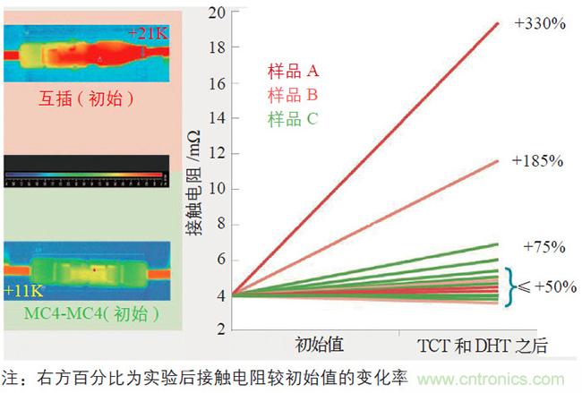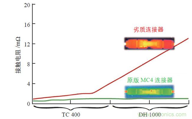 從光伏連接器的外觀和質(zhì)感可大致了解該產(chǎn)品的外形設(shè)計(jì)及絕緣材料的選擇。但是,評價光伏連接器好壞的核心指標(biāo)是公母連接器對插之后的接觸電阻。一個高質(zhì)量的連接器須具有很低的接觸電阻,并能夠長期維持這種低接觸電阻狀態(tài)。根據(jù)光伏連接器最新國際標(biāo)準(zhǔn)IEC 62852,公母對插后的接觸電阻在TC200+DH1000 測試后,增量不能大于5 mΩ或者電阻終值小于初始值的150%。而這僅是最低要求,不同廠商連接器的接觸電阻值取決于制造商的技術(shù)水平。對于如何評判接觸電阻,TC400(2×TC200)和DH1000 實(shí)驗(yàn)提供了一個解讀方向。圖2 為實(shí)驗(yàn)比較后的結(jié)果,由圖2 可知,高質(zhì)量的光伏連接器的接觸電阻非常穩(wěn)定,這主要得益于其所使用的電連接技術(shù)。因此,客戶在選擇光伏連接器時,須對其所使用的核心技術(shù)進(jìn)行全面的了解。