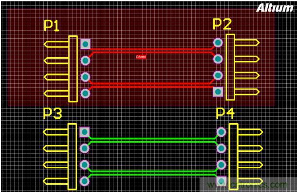 很明顯,2組同樣連線同樣間距的差分對,在Room里的對象沒有報(bào)錯(cuò),使用新建Room設(shè)置的規(guī)則。而Room外的對象依然是報(bào)錯(cuò)狀態(tài)。這就是Room為不同區(qū)域設(shè)置規(guī)則的效果。