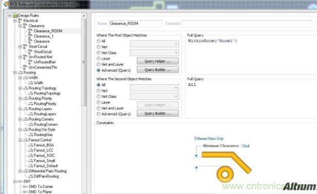 在Room里框選出一定區(qū)域后,不僅僅是可以單獨(dú)設(shè)置線寬規(guī)則,還可以對它設(shè)置PCB Rule規(guī)則定義頁面上的任意規(guī)則。
