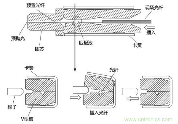 光纖快速連接器/冷接子可分為預(yù)置光纖和非預(yù)置光纖兩大類。預(yù)置光纖快速連接器/冷接子的接續(xù)點(diǎn)在連接器內(nèi)部,并預(yù)置有匹配液;非預(yù)置光纖快速連接器/冷接子的接續(xù)點(diǎn)在連接器表面,不預(yù)置匹配液,直接通過適配器與目標(biāo)光纖對(duì)接。非預(yù)置光纖快速連接器/冷接子的工作原理很簡(jiǎn)單,這里不做贅述。下面詳細(xì)說明預(yù)置光纖快速連接器/冷接子的原理:如下圖所示,預(yù)置光纖膠接在插芯中,接續(xù)點(diǎn)設(shè)在放有折射率近似纖芯的導(dǎo)光材料-匹配液的V型槽中,從而實(shí)現(xiàn)預(yù)置光纖和目標(biāo)光纖的無縫貼合。