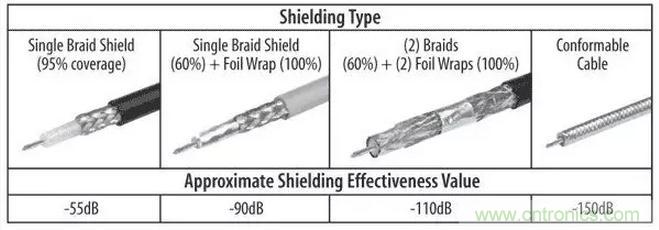 圖4:同軸電纜屏蔽可以用編織物、箔片或組合實(shí)現(xiàn),以產(chǎn)生與電纜頻率不同的衰減規(guī)格。