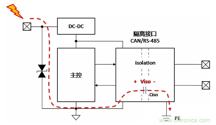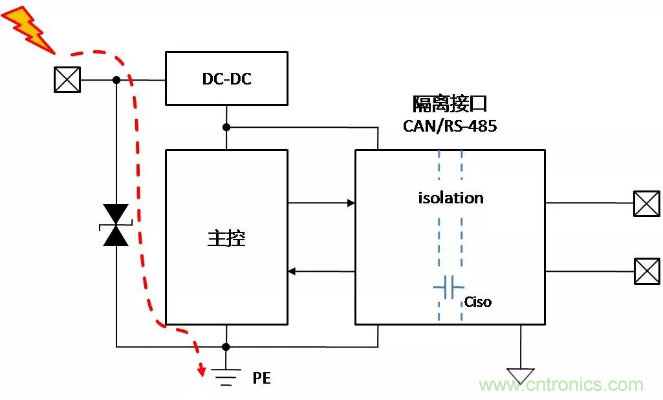 假設(shè)控制側(cè)均做了足夠的保護(hù)措施,當(dāng)控制側(cè)接口受到靜電放電時(shí),能量通過控制側(cè)保護(hù)器泄放至PE,對(duì)隔離通信接口基本無影響,如下面圖2。