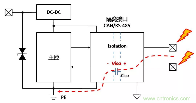 當(dāng)總線側(cè)接口受到靜電放電時(shí),靜電能量通過隔離接口模塊內(nèi)部總線側(cè)器件泄放至PE,但若ESD能量超出了接口模塊內(nèi)部總線側(cè)器件的ESD抗擾能力,總線接口則可能損壞,如下面圖5。