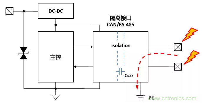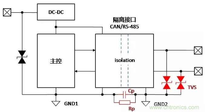 總線增加隔離固然可以保證總線穩(wěn)定可靠地通信,但是帶隔離通信接口的設(shè)備,在復(fù)雜的環(huán)境或安裝狀態(tài)下,接口會(huì)表現(xiàn)出完全不同的ESD特性,了解ESD對(duì)接口的影響機(jī)理,才能有針對(duì)性地增加保護(hù)器件,提升隔離接口的ESD能力。下面以帶有隔離CAN或RS-485通信接口為例,對(duì)常見的設(shè)備狀態(tài)下,ESD的作用機(jī)理進(jìn)行分析,并提出相應(yīng)的改善措施。