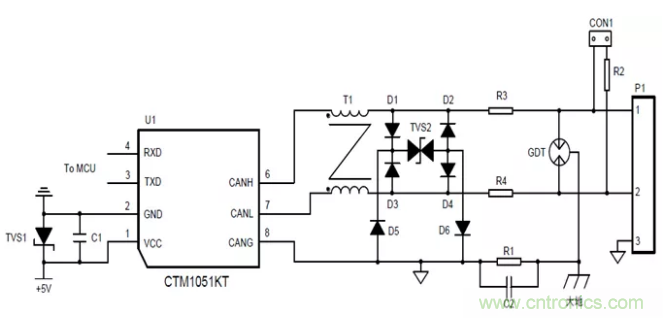 前面只是對(duì)ESD的作用機(jī)理進(jìn)行了分析,但隨著工業(yè)產(chǎn)品對(duì)通信接口的EMC等級(jí)要求越來越高。許多應(yīng)用要求滿足IEC61000-4-2靜電放電4級(jí),IEC61000-4-5浪涌抗擾4級(jí)要求。一般的收發(fā)器ESD、浪涌的防護(hù)等級(jí)均比較低,如CTM1051M隔離CAN收發(fā)器的隔離耐壓為2500VDC,裸機(jī)情況下,ESD、浪涌等級(jí)均較低。所以有必要增加外圍電路,提高通信端口的EMC等級(jí)。
