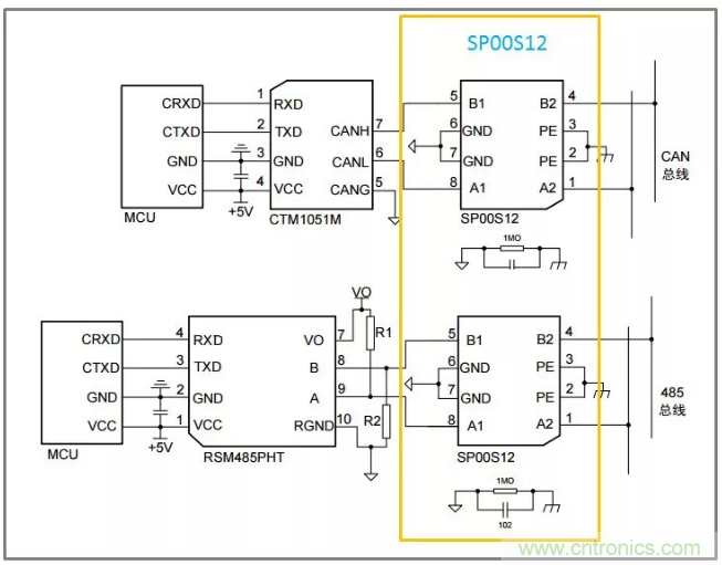 另一種方案則是采用ZLG的SP00S12浪涌保護(hù)模塊,可用于各種信號(hào)傳輸系統(tǒng),抑制雷擊、浪涌、過壓等有害信號(hào),對(duì)設(shè)備信號(hào)端口進(jìn)行保護(hù)。搭配ZLG的全隔離CTM或SC系列的隔離CAN收發(fā)器,如下圖??蓸O大程度的提升產(chǎn)品的集成度,于此同時(shí)極大程度的縮小開發(fā)周期。