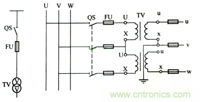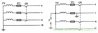 圖6:電壓互感器二次側(cè)的接地方式 說明:圖6(a)中性點接地;圖6(b)v相接地