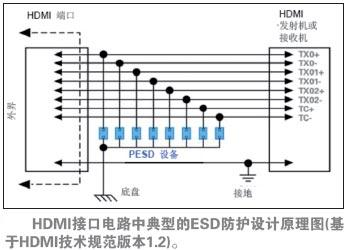 圖6.HDMI接口電路中典型的ESD防護(hù)設(shè)計原理圖(基于HDMI技術(shù)規(guī)范版本1.2)。