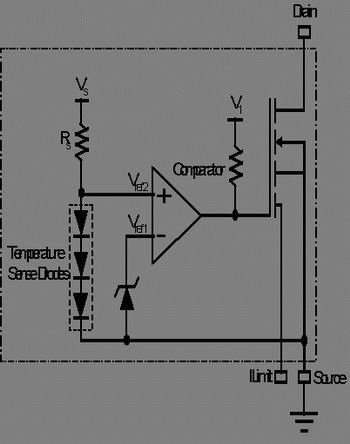 此新型過熱保護電路的關鍵之處就是功率SENSEFET的結溫是通過實際測量而不是估計的。由于該電路所提供的過熱保護不受其它次要因素,如瞬時脈沖、周圍溫度、系統(tǒng)氣流以及銅線面積的影響,使其非??煽考胺€(wěn)固。