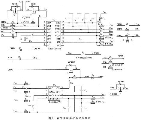 圖1為四節(jié)電池串聯(lián)使用時(shí)的保護(hù)系統(tǒng)原理圖。