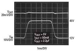 圖3LT3050針對負載突降情況的瞬態(tài)響應(AC耦合)