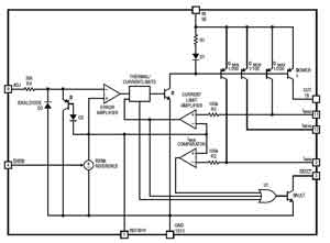 可編程短路檢測和電流限值在IMAX引腳上提供,而且該限值一旦設定,則其在整個電壓和溫度范圍內的波動幅度將小于5%。IMAX引腳是一個特別設計的電流反射鏡器件的集電極,可提供大約為輸出電流1/200的電流。該引腳同時也是精準限流放大器的輸入端。在IMAX和GND之間連接一個電阻器(RI(MAX)),用于設定短路檢測和可編程電流限制門限。限流放大器電路執(zhí)行兩項功能。第一項功能是:如果IMAX引腳電壓達到600mV,則它將確定集電極開路/FAULT引腳邏輯電平。第二項功能是:它將調節(jié)輸出驅動電流以使IMAX引腳電壓不超過600mV,從而將輸出電流限制為0.6V•200/RI(MAX)。