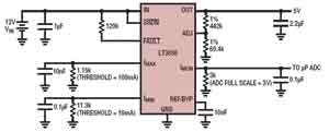 LT3050可向汽車的控制系統提供診斷信息。如果檢測到開路或短路情況、或者IC進入熱停機模式,則一個能夠吸收100μA電流的集電極開路故障指示器將確定其電平。LT3050還具有一個集成電流監(jiān)視器,該電流監(jiān)視器通過IMON引腳提供約為輸出電流1/100的電流,以在天線系統監(jiān)視和保護中使用(見圖5)。只需在IMON和GND之間連接一個電阻器,便可產生一個與輸出電流成比例的參考于地的電壓。