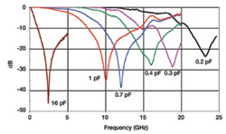 我們必須認(rèn)識到薄膜電容器用作帶阻濾波器是具有局限性的。因?yàn)楸∧る娙萜魍ǔV荒芴峁┬‰娙葜?,所以它們局限于頻率相對較高的帶阻濾波器設(shè)計(jì)。如果涉及到低頻設(shè)計(jì),必須采用其他的濾波器方法,通常是使用高Q值的多層射頻電容器。