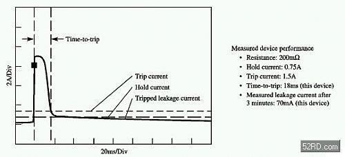 動(dòng)作時(shí)間是PPTC在故障情況下對(duì)動(dòng)作速度的特性所進(jìn)行之描述。在小功率應(yīng)用條件下,動(dòng)作時(shí)間是關(guān)鍵因素,因?yàn)樵谡麄€(gè)系統(tǒng)的電壓降低或減弱且系統(tǒng)性能受到影響之前,小型電源維持在短路電流而不受損的時(shí)間可能很短。動(dòng)作時(shí)間數(shù)值與元件的設(shè)計(jì)、元件的大小和工作電流性能有很大關(guān)系,且還要考慮到電路板設(shè)計(jì);即電路板上較寬的連線或較大的焊接器等同于散熱器,均可增加動(dòng)作時(shí)間??s小焊接器的尺寸,選擇較低的工作電流能夠改善動(dòng)作時(shí)間性能。
