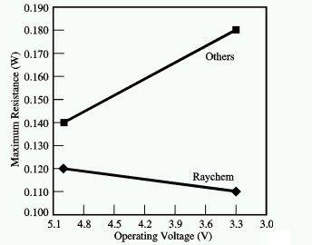 在USB的設(shè)計(jì)中,另一項(xiàng)重要的考慮因素是隨著電壓的下降,電阻值也會(huì)下降。隨著供電電壓的下降,電壓降問題顯得更加突出。一般來說,電壓下降將導(dǎo)致電源開關(guān)的導(dǎo)通電阻增加,這是一種不期望的特性。但Raychem的PowerSwitch元件的電阻卻能夠隨著供電電壓的下降而下降,因而避免這不利特性。如圖7所示,在匯流排電壓較高時(shí),PowerSwitch能夠減少輸出電流值,提升電源的效率和電池的使用壽命。在匯流排電壓較低時(shí),PowerSwitch兩端的電壓降也會(huì)降低,這樣USB功能就能繼續(xù)工作一段更長的時(shí)間。