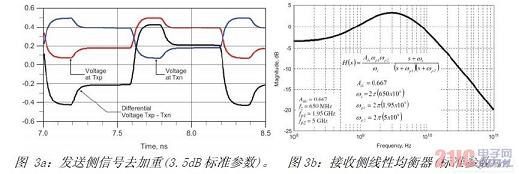 這些寄生電容存在于USB3.0收發(fā)器內(nèi)部和/或PCB外部。不匹配的PCB線路、USB3.0連接器或其它并聯(lián)電容器等,均會(huì)造成外部寄生電容。因此,這些額外的并聯(lián)電容器必須盡可能小。還必須考慮到USB3.0電纜的低通頻率響應(yīng)(圖2b)。為抵消高頻內(nèi)容的衰減,可在發(fā)送側(cè)和接收側(cè)利用專用均衡器改變信號(hào)。這些措施均有助于加快信號(hào)上升和下降邊的速度,從而得到張得更開的眼圖(即更高的信號(hào)完整性)(見圖3a和圖3b)。