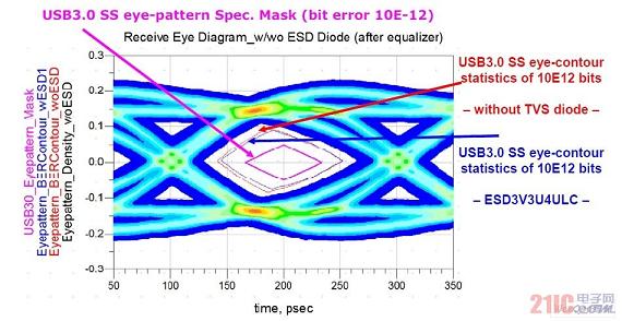 模擬所用誤碼率為1E6。根據(jù)模擬結(jié)果,推導(dǎo)出誤碼率為1E12時(shí)的眼圖張開程度(紅色和藍(lán)色輪廓線)。分別在未帶TVS二極管(紅色輪廓線)和帶有TVS二極管(ESD3V3U4ULC,藍(lán)色輪廓線)的情況下,計(jì)算出眼圖的張開程度(圖7)。在主機(jī)側(cè)和設(shè)備側(cè)帶和未帶ESD3V3U4ULC時(shí)的眼圖圖7:在主機(jī)側(cè)和設(shè)備側(cè)帶和未帶ESD3V3U4ULC時(shí)的眼圖。在主機(jī)側(cè)和設(shè)備側(cè)帶有超低電容TVS二極管ESD3V3U4ULC,眼圖張開程度(輪廓線)會(huì)受到一定影響。雖然眼圖張開程度會(huì)略微減小,但相比于USB3.0技術(shù)規(guī)范中規(guī)定的基準(zhǔn)模式(紅紫色輪廓線),仍大出許多。