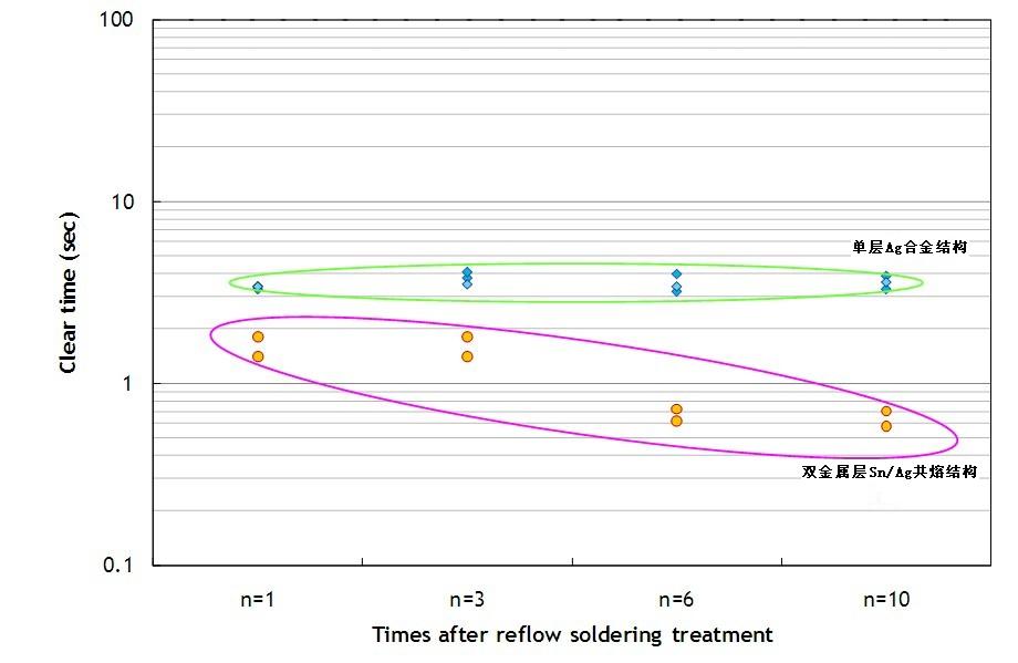 單層Ag合金結構的保險絲即使經(jīng)過多次高溫熱處理,仍可以維持較穩(wěn)定的熔斷時間。但是雙層Sn/Ag共熔結構的保險絲,其熔斷時間有明顯變快的趨勢。