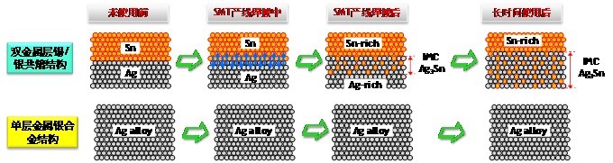 圖7 單金屬層Ag合金結構與雙金屬層Sn/Ag共熔結構,在SMT焊接前后及長時間使用后的材料與結構變化示意圖。