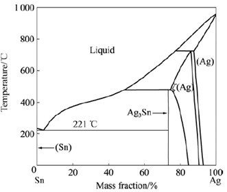 在Sn-Ag二元相圖上(圖1),僅存在兩種Sn-Ag中間金屬化合物(IMC),一是Ag4Sn (ζ相),另一個是Ag3Sn(ε相)。 在過去一些學者如Sen等[2]發(fā)現(xiàn)在氣相沉積Sn/Ag偶在室溫條件下形成Ag3Sn IMC; 另外Arai等[3]發(fā)現(xiàn)在電鍍共沉積Sn-Ag合金中也只形成Ag3Sn金屬化合物。