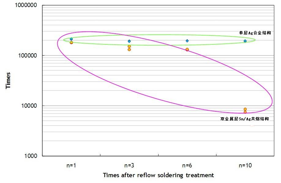 單層Ag合金結構的保險絲即使經(jīng)過多次高溫熱處理,仍可以維持一定的耐脈沖能力,承受脈沖次數(shù)都可達十萬次以上。但是雙層Sn/Ag共熔結構的保險絲,其承受脈沖能力有明顯下降的趨勢,在經(jīng)過10次回流焊錫爐熱處理后,承受脈沖次數(shù)就會下降到十萬次以下。