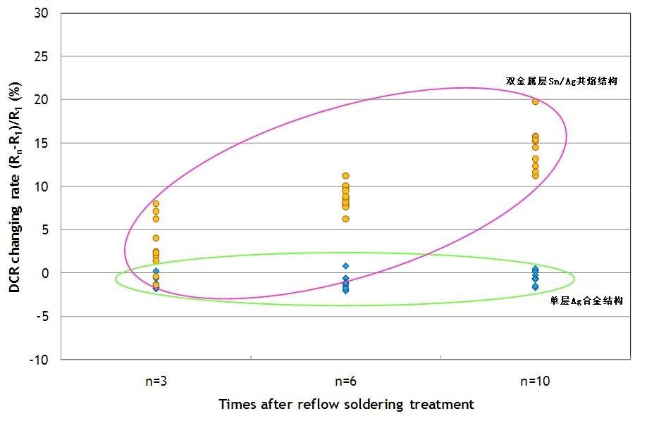 單層Ag合金結構的保險絲即使經(jīng)過多次高溫熱處理,其冷阻抗變化很小。但是雙層Sn/Ag共熔結構的保險絲,其冷阻抗有明顯變高的趨勢(約升高10~20%),且變異也較大。