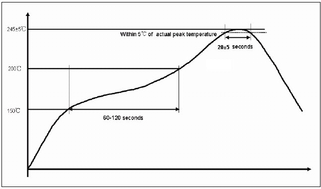2.回流焊錫爐內溫度條件(圖2),最高溫245±5?C/20±5秒,作業(yè)時間240±10秒。