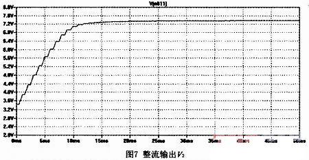 整流電路由D1、R10、C6組成(參見圖6)。它起到了平緩放大后信號(hào)的變化幅度,使它接近直流信號(hào)的作用。當(dāng)V1和V2之間的壓差大于二極管的導(dǎo)通電壓時(shí),二極管導(dǎo)通,對(duì)電容C6充電(同時(shí)一部分電流流過R10及比較器的輸入阻抗);當(dāng)V1和V2的壓差小于二極管的導(dǎo)通電壓時(shí),二極管截止,電容上的電荷通過R10(及比較器的輸入阻抗)放電。當(dāng)放電到V1和V2的壓差再次大于二極管的導(dǎo)通電壓時(shí),二極管導(dǎo)通,又開始充電的過程。該電路就反復(fù)地進(jìn)行這樣的充放電過程。由于R10、C6值都很大,放電的速度很慢,電容電壓接近直流。由微分方程可得,放電時(shí)間T=RC1n(Vo/Vt),Vo為放電初始電壓,Vt為放電后的電壓,R為放電通路的電阻值,C為放電的電容值。可見R,C越大,放電時(shí)間越長,即電壓越不容易變化。圖7為整流濾波的仿真輸出。