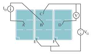 圖2顯示了測量的結(jié)構(gòu)。3個(gè)MOSFET和6個(gè)探針均在圖中顯示出來,電接觸則示意性地畫出。中間的MOSFET是待測器件。