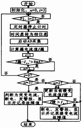 漏電流檢測(cè)的流程圖如圖3所示。漏電流信號(hào)過零點(diǎn)后,開始AD采樣轉(zhuǎn)換,根據(jù)定時(shí)器測(cè)得漏電流和工作電壓之間的時(shí)間差計(jì)算相位差,得到漏電流的大小,將連續(xù)3個(gè)周期同一時(shí)刻的值分別與突變電流和緩變電流的設(shè)定值作比較,判斷當(dāng)前是否發(fā)生漏電;若漏電,漏電由緩變電流引起還是突變電流引起;若大于整定值則立刻斷電并顯示系統(tǒng)當(dāng)前故障值并報(bào)警等。