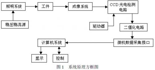 整個檢測系統(tǒng)由照明系統(tǒng)、被測工件系統(tǒng)、成像物鏡、CCD 光電檢測系統(tǒng)和計算機測控系統(tǒng)(8031 單片機和8279 鍵盤/顯示芯片等)構(gòu)成。穩(wěn)壓穩(wěn)流調(diào)光電源為遠(yuǎn)心照明系統(tǒng)提供穩(wěn)定的照明光,被照明的工件經(jīng)成像物鏡成像在線陣CCD 的光敏陣列面上。由于工件不透光,工件的像在中間部分形成暗帶,兩側(cè)形成亮帶。 暗帶的寬度就是工件尺寸所成像的大小。線陣CCD 在驅(qū)動脈沖的作用下完成光電轉(zhuǎn)換并產(chǎn)生視頻信號。其系 統(tǒng)原理圖如圖1。