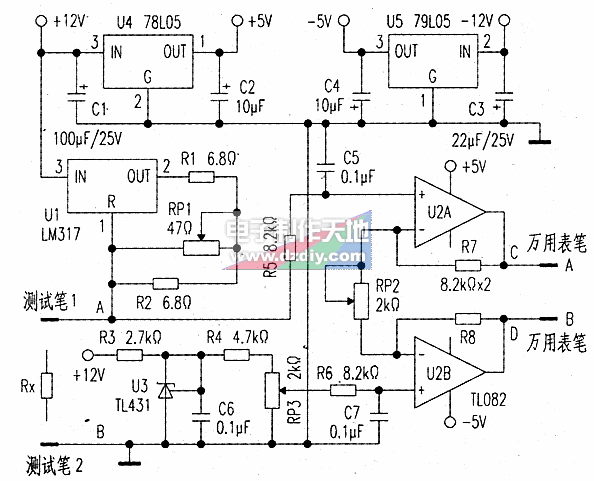 由運(yùn)算放大器U2A和U2B及R7、R8、RP2(精密電位器)構(gòu)成電壓放大電路,對被測電阻兩端的電壓進(jìn)行10倍放大,這樣數(shù)字萬用表從C、D兩點(diǎn)測得的電壓值就可以與被測電阻RX的阻值相對應(yīng)(1mV對應(yīng)1mΩ,1V對應(yīng)1Ω)。