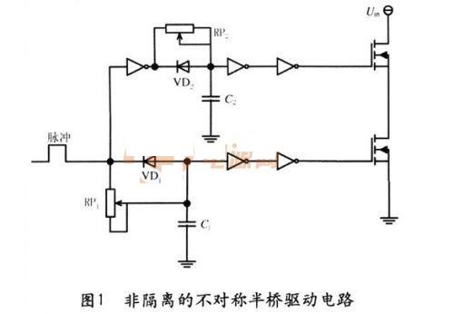 圖1為常用的小功率驅(qū)動(dòng)電路,簡單可靠成本低,適用于不要求隔離的小功率開關(guān)設(shè)備。其中一路直接接到下管,另外一路經(jīng)反向器反向后驅(qū)動(dòng)上管。RP1,RP2用于調(diào)節(jié)死區(qū)時(shí)間。