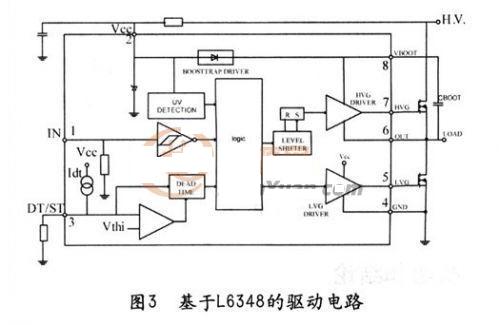 ST公司的L6384是專門的不對(duì)稱半橋驅(qū)動(dòng)芯片,其原理圖及外圍電路如圖3所示。單脈沖從1腳(IN)輸入,5腳(HVG)和7腳(LVG)輸出互補(bǔ)的脈沖。3腳(DT/ST)外接電阻和電容來控制兩路輸出的死區(qū)時(shí)間。當(dāng)3腳的電平低于0.5V的時(shí)候,芯片停止工作。專用芯片具有外圍電路簡單、占用空間小的特點(diǎn),但由于其成本較高,不適用于低成本設(shè)計(jì)的產(chǎn)品