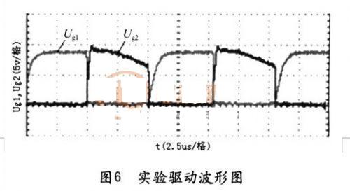 本文設(shè)計(jì)了一臺(tái)不對(duì)稱半橋變換器樣機(jī):工作頻率為98kHz,輸人電壓為400VDC,輸出電壓為30VDC。測得占空比為0.47時(shí)的驅(qū)動(dòng)波形Ug1,Ug1如圖(6)所示。