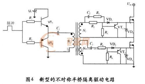 根據(jù)以上幾種驅(qū)動(dòng)電路,針對(duì)傳統(tǒng)隔離驅(qū)動(dòng)電路結(jié)構(gòu)復(fù)雜、占用空間大和不對(duì)稱半橋?qū)S眯酒?qū)動(dòng)電路應(yīng)用的局限性等問題,提出了一種新型的不對(duì)稱半橋隔離驅(qū)動(dòng)電路,適用于單脈沖輸出的芯片,具有結(jié)構(gòu)簡單可靠,占用空間小等特點(diǎn),并且實(shí)現(xiàn)了電氣隔離,可以運(yùn)用于中大功率場合。