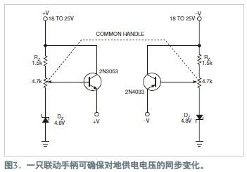 由于晶體管的基-集電極反偏擊穿電壓各不相同,因此電路提供了一種改變電源電壓的簡單方式(圖3)。隨著電壓的升高,與發(fā)射極連接的兩只LED都發(fā)光,而集電極只有一個LED發(fā)光(圖2中b和d)。±4V的基本電壓足夠用于檢測晶體管的基極或類型。如將電源電壓從±4V增至±15V,就可以測試很多種晶體管的發(fā)射極??紤]到串聯(lián)LED的壓降,這個范圍可為基射結提供最高26V以上的反向擊穿電壓。