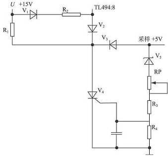 工作原理: 數(shù)控開關(guān)電源由輔助電源+ 15 V 提供給可控硅V4管陽極工作電壓, 實際輸出取樣電壓送至穩(wěn)壓管V5 , 當超出保護電壓閾值+ 5. 5 V 時, 輸出電壓經(jīng)穩(wěn)壓管、電阻R3 、R4 分壓觸發(fā)可控硅V4 導(dǎo)通, 將輔助電源+ 15 V 通過電阻R1接地, 同時通過二極管V2切斷8 腳電源。調(diào)節(jié)RP 電位器, 可以對輸出電壓保護閾值點進行設(shè)置?! ?br />