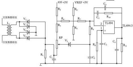 本開關(guān)電源過流保護電路的工作原理見圖4。變壓器T 1原邊串接在開關(guān)電源主變壓器原邊回路中, 通過實驗選擇合理的變壓器原副邊匝數(shù)比,感應(yīng)開關(guān)電源變換時的原邊電流值, 經(jīng)二極管V1 ~ V4 整流, R1、C1 濾波后送電位器RP。原邊電流越大,電流取樣變壓器整流出的電壓越大, 電位器RP 中心點電壓越低,TL494: 2 腳電壓隨之下降, 使得TL494: 3 腳電壓升高,送入脈寬調(diào)制器, 將T L494 驅(qū)動脈沖寬度逐漸減少, 從而得到過流保護的目的。圖中電容C4、C5、R10為TL494 誤差放大器的反饋元件, 使得放大電路穩(wěn)定可靠。